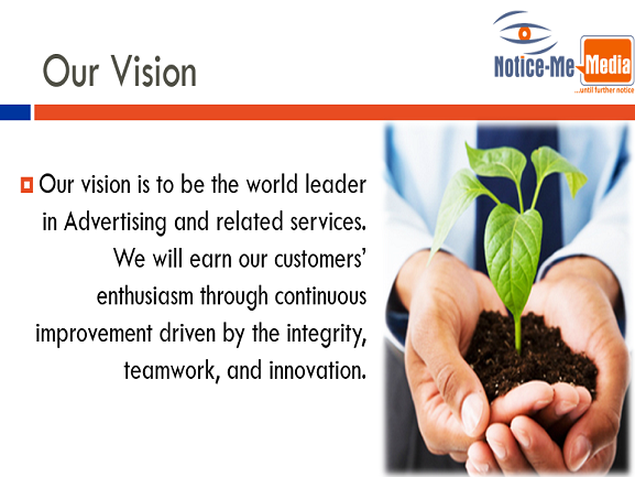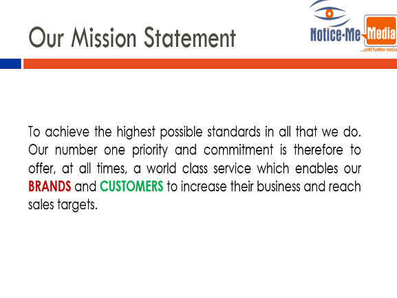Notice-Me Media Ltd, is a brand and impression management outfit that specializes in out of home (outdoor) and indoor advertising, branding, marketing communication and strategic outdoor media management and consultancy. We are poised to bridge the gap between brands and the generality of customers by infusing clients brand identity into every brief with a guarantee of a rich professional experience.